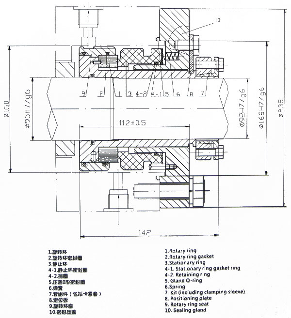 适用范围: 压力:0~3.0MPa 轴径:ф92mm 温度:泵腔:≤+200℃ 密封腔:0~+70℃ 线速度:≤50m/s 介质:清水、碳氢化合物及弱腐蚀性液体。